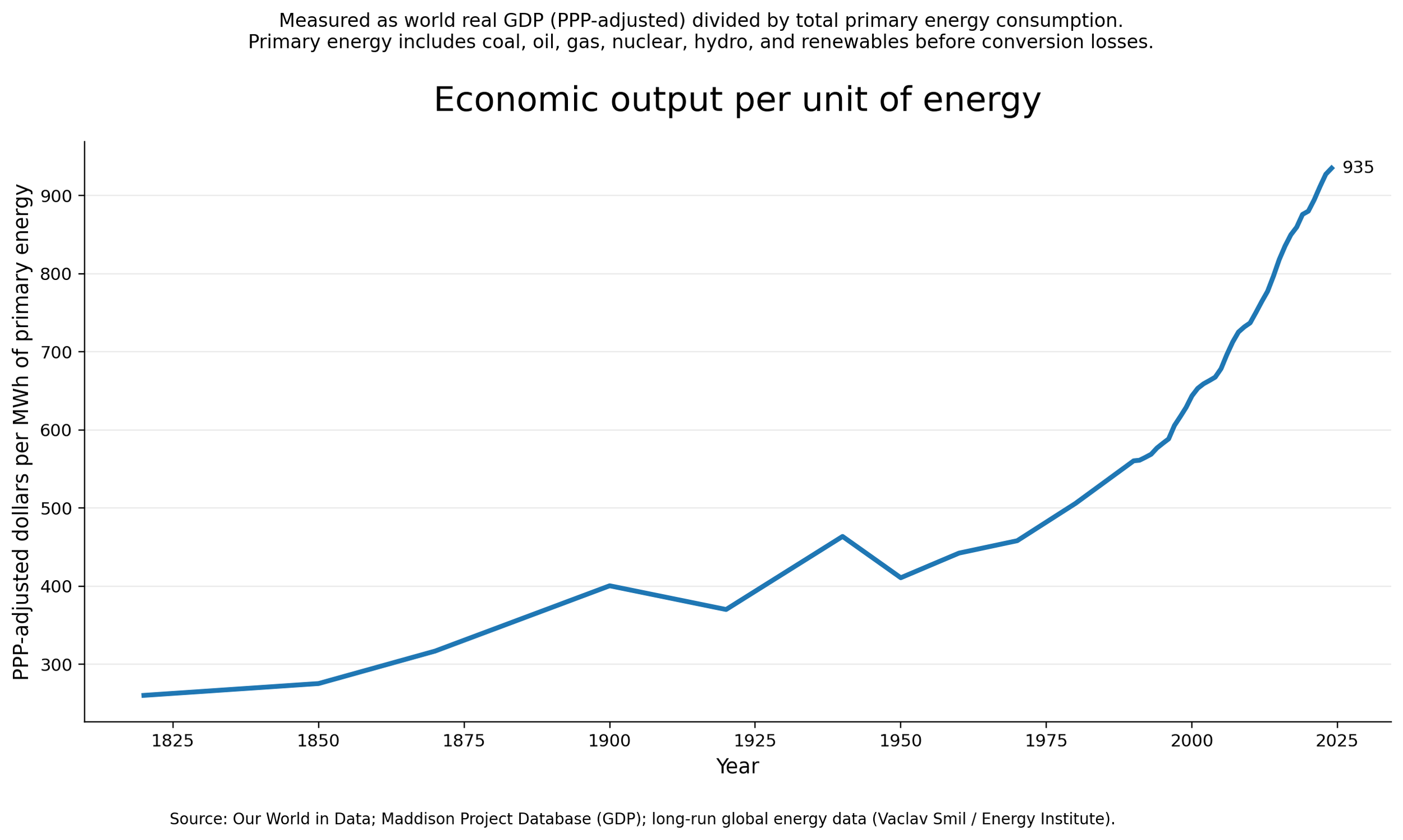 At civilization scale, GDP per unit of primary energy serves as a rough proxy for that relationship, using an economy-level unit of work rather than a prompt or task. It provides a normalized metric that extends across long historical periods, which makes comparisons possible in a way few other measures do. It is a blunt proxy, and its limits are material. GDP misses distribution, quality, unpaid work, badly priced goods, and large categories of social value that markets only capture imperfectly. But it still shows something important across long time horizons: industrial societies have repeatedly learned how to generate much more output from each unit of energy than they did before.
