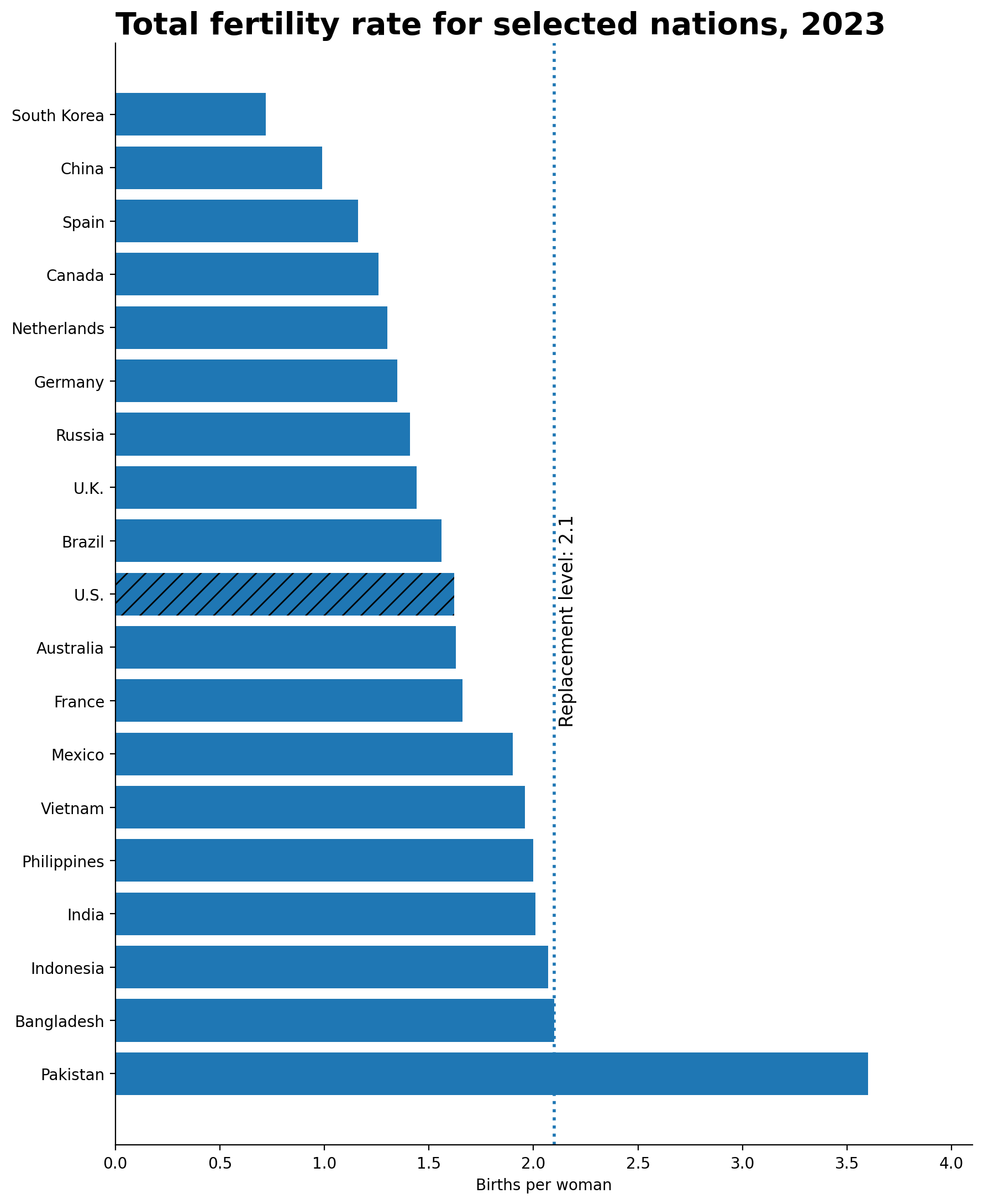 Source: Country comparison built against the World Bank total-fertility-rate indicator for 2023. This version is a recreation of the article’s selected-country graphic, so the country list, ordering, and bar lengths were matched to the screenshot rather than exported directly from the World Bank table one country at a time.