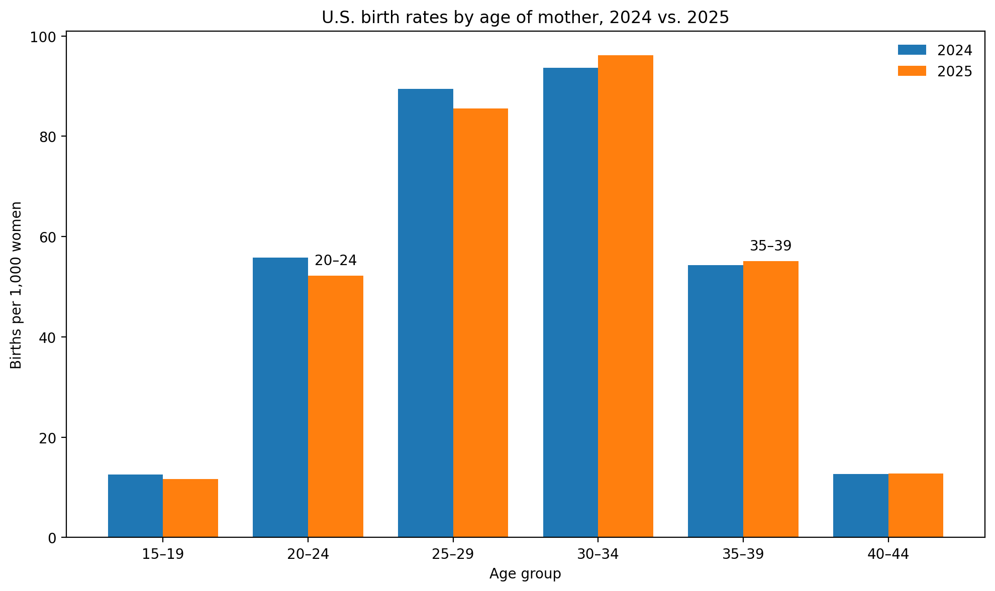 Fig. A. U.S. birth rates by age of mother, 2024 vs. 2025.