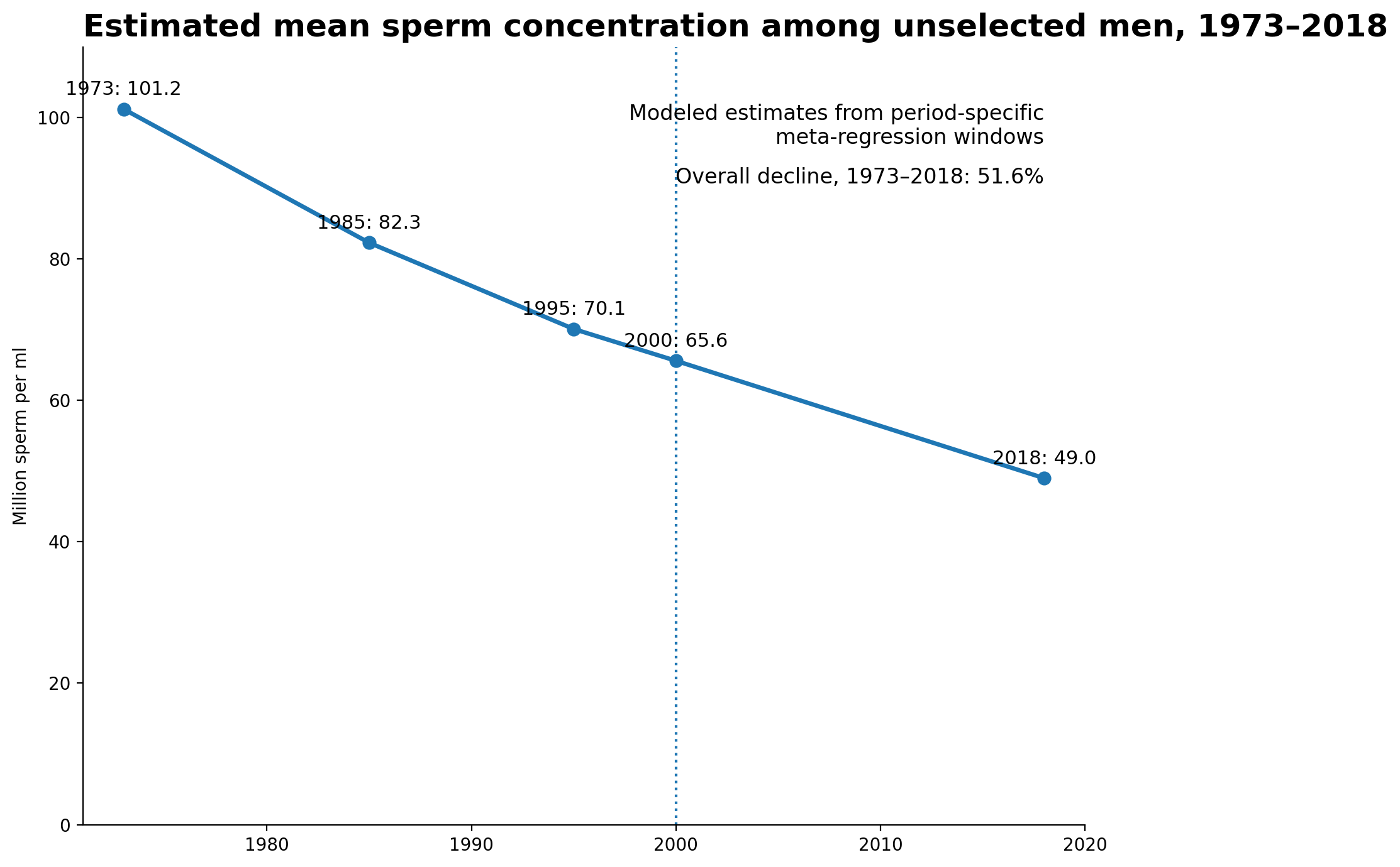 Fig. C. Estimated mean sperm concentration among unselected men, 1973–2018.